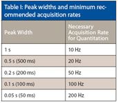 Acquisition rate is a very important factor to consider when choosing an MS detector for gas chromatography (GC). With advances in the technology of GC, including narrow-bore capillary GC, high-speed GC, and comprehensive two-dimensional GC (GC×GC), peak widths are becoming narrower. This is creating a need for an MS detector with acquisition rates capable of obtaining enough data points to sufficiently define them. Table I shows an example of chromatographic peak widths and the acquisition rates recommended for successful quantitative analyses.