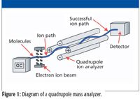 The quadrupole mass spectrometer is a scanning mass analyzer that uses the stability of ion trajectories in oscillating electric fields to separate them according to their mass-to-charge ratios (m/z). It comprises four parallel rods arranged as shown in Figure 1. A constant DC potential is applied to each rod pair, one pair positive and the other negative, on opposite planes. An alternating potential with frequency in the region of radio waves is superimposed over the DC potential on each rod pair. This radio frequency (RF) voltage causes the ions to spiral as they traverse the quadrupole toward the detector. This arrangement acts as a high pass m/z filter in one plane (+), and a low pass m/z filter in the other plane (–). Typically, the DC and RF potentials are adjusted so that only one m/z at a time can traverse the quadrupole. All others collide with the rods and are neutralized. To acquire a mass spectrum, the DC and RF potentials must be scanned in constant ratio across a range. Therefore, acquiring a broader mass range requires a longer scan time.