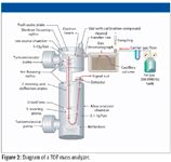 A time-of-flight (TOF) mass spectrometer is a nonscanning mass analyzer that emits pulses of ions (or transients) from the source. The ions are accelerated so that they have equal kinetic energy before entering a field free drift region, also known as the flight tube. See Figure 2 for a diagram of a TOF-mass spectrometry (MS) system. Because kinetic energy is equal to ½ mv2, where m is the mass of the ion and v is the ion velocity, the lower the ion's mass, the greater the velocity and shorter its flight time. The travel time from the ion source through the flight tube to the detector can be transformed to the m/z value through the relationships described previously. Because all ion masses are measured for each transient, TOF mass spectrometers are well-suited for the analysis of both targeted and nontargeted analytes. A nonscanning instrument such as a TOF-MS system offers many advantages including fast acquisition rates, spectral continuity, and exceptional dynamic range. The ability to acquire full mass range spectra without sacrificing speed or sensitivity makes TOF-MS an excellent choice for qualitative and quantitative analyses across a wide dynamic range in the presence of complex matrices.