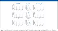 With quadrupole MS or other scanning instruments, a scan is initiated at one point in time. As the scan progresses, time elapses and therefore, the last data for the scan is collected at a second point in time. During the scanning process, analyte concentrations change in the source, resulting in skewed spectra. The skew is corrected by averaging spectra across the apex of the chromatographic peak. This significantly complicates the mathematics of deconvolution in the case of overlapped spectra. Figure 4 shows an example of the spectral continuity (left spectra) offered by TOF-MS as compared to the skewed spectra (right spectra) typical of scanning instruments.