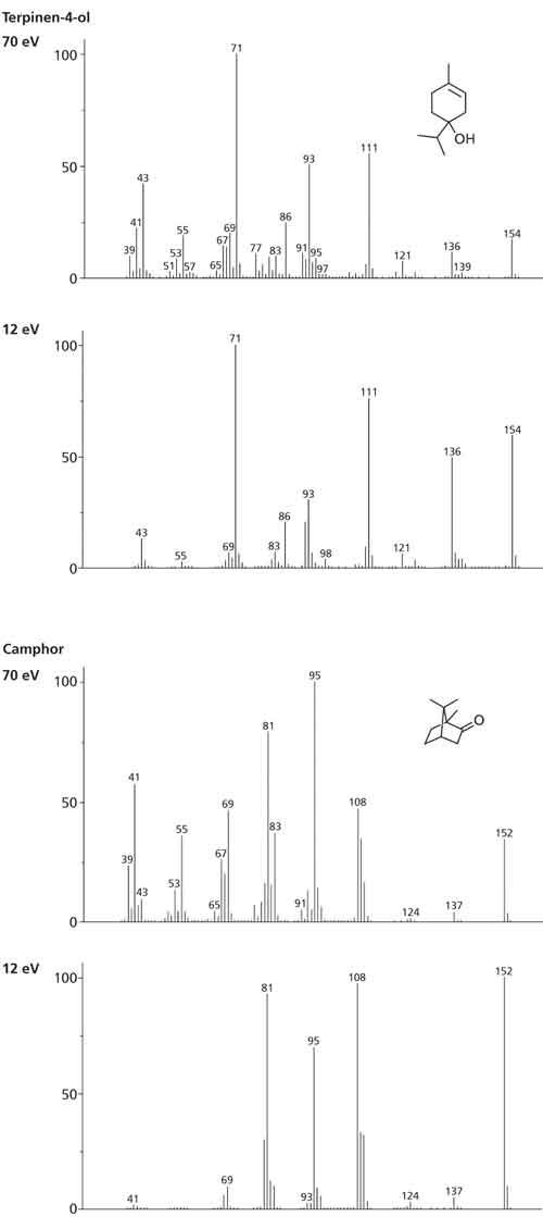 Figure 6: Spectral comparisons at 70 eV and 12 eV for terpinen-4-ol (MW 154) and camphor (MW 152), showing enhanced molecular (and structurally significant) ions and reduced fragmentation using soft EI.