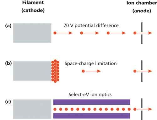 Figure 1: The operation of an electron ionization ion source using (a) conventional (70 eV) ionization energies, (b) low ionization energies, and (c) variable-energy ionization.