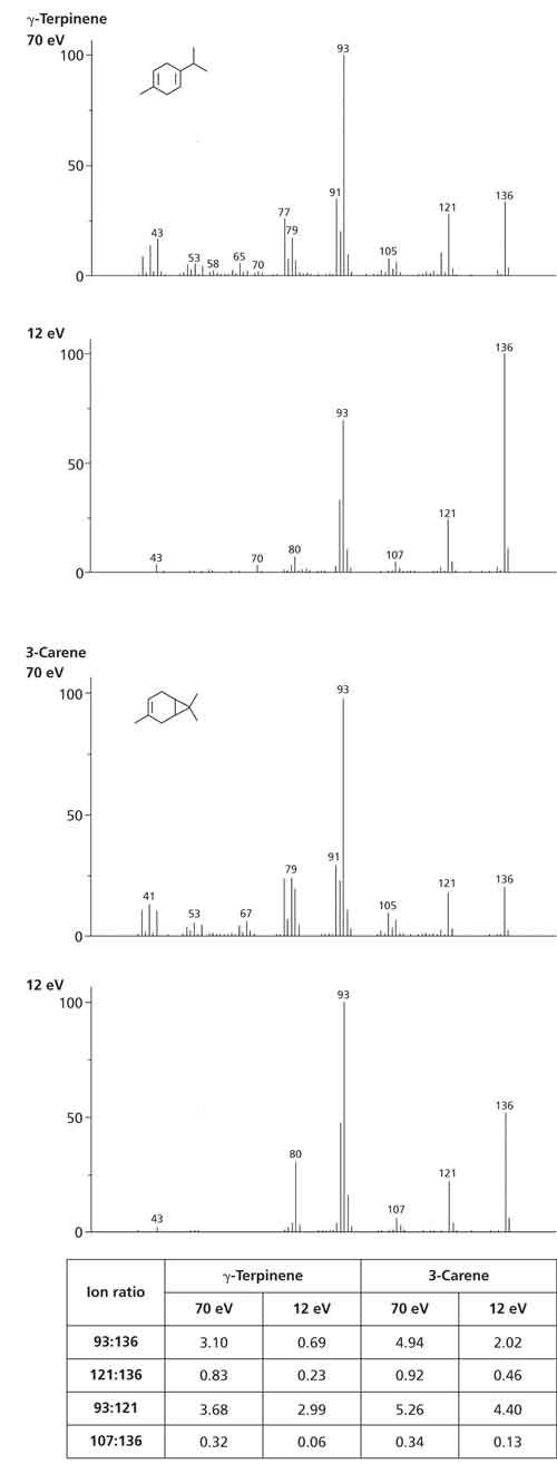 Figure 7: Spectral comparisons at 70 eV and 12 eV for two monoterpene isomers γ-terpinene and 3-carene, showing the similarity at 70 eV and differences in ion abundance at 12 eV, assessed by means of ion ratios.