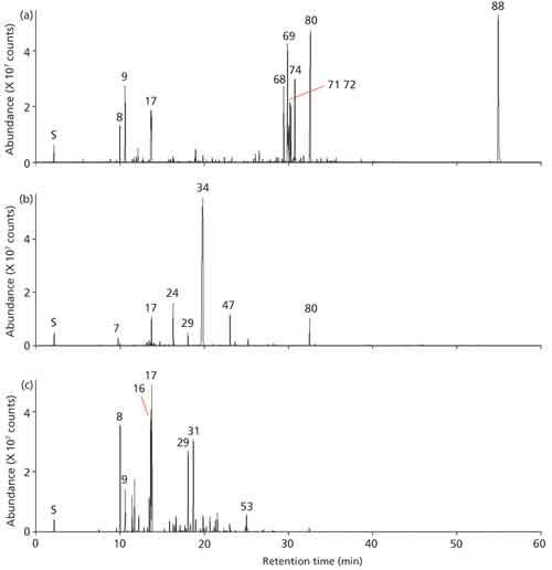 Figure 3: GC-TOF-MS analyses of (a) ginger, (b) wintergreen, and (c) rosemary essential oils. Peaks: S = Solvent (methyl tert-butyl ether) 7 = α-thujene, 8 = α-pinene, 9 = camphene, 16 = limonene, 17 = eucalyptol, 24 = linalool, 29 = camphor, 31 = isoborneol, 34 = methyl salicylate, 47 = hydroxycitronellal, 53 = α-terpinyl acetate, 68 = α-curcurmene, 69 = zingiberene, 71 = α-farnesene, 72 = β-bisabolene, 74 = β-sesquiphellandrene, 80 = diethyl phthalate, 88 = bis(2-ethylhexyl) phthalate.