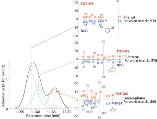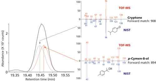 An additional advantage of time–of–flight mass spectrometry (TOF–MS) for this application, compared to conventional quadrupole instruments, is the ability to record full–range mass spectral information to extremely high densities (10,000 transient spectral accumulations per second). This density of information enables algorithms to uncover peaks that are masked by matrix interferences, or––of particular relevance to essential oils––deconvolve coeluted peaks to obtain cleaner spectra and consequently improve the confidence in identification.