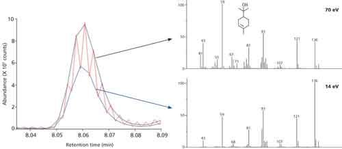 This technique has already been applied to studies of samples containing analytes that are challenging to differentiate with conventional 70 eV ionization––including hydrocarbons (9,10) and certain groups of environmental contaminants (11). An additional development improves laboratory efficiency by allowing 70 eV and low–eV spectra to be acquired simultaneously, with two sets of spectra being generated for every peak across the whole analytical run (Figure 2). This also allows ion ratios between low–eV and 70–eV spectra to be used as an additional qualifier for compound identification, which is especially useful for the speciation of similar terpenes in essential oils.