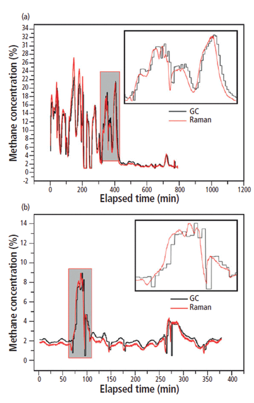 Figure 5: Comparison of GC (black curve) and Raman gas analysis system (red curve) results for methane, as measured at two mud-logging sites, (a) for 13 h, and (b) for 6 h. Adapted with permission from reference 5, copyright 2017 Elsevier.