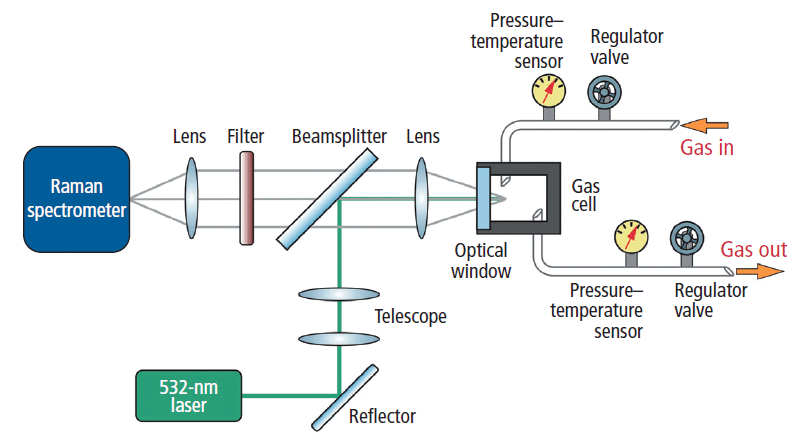 Laser light was delivered to the gas cell via a longpass dichroic beamsplitter designed to reflect the 532-nm laser and pass the Raman scattered light while excluding Rayleigh scattering (Figure 1). A 20-mm focal length lens focused laser light into the gas cell through a sapphire window, also collimating emitted Raman scattering for transmission through the longpass dichroic. The telescope in the laser path expanded the beam to enable a tighter focus of laser light into the gas cell. Rayleigh scattering in the signal path was further suppressed by a longpass filter, after which the Raman scattered light was focused onto the 25-µm entrance slit of the spectrometer by a 30-mm focal length achromatic lens. Throughout the measurements, the gas cell temperature and pressure were monitored, and pressure–flow was precisely controlled using regulator valves.