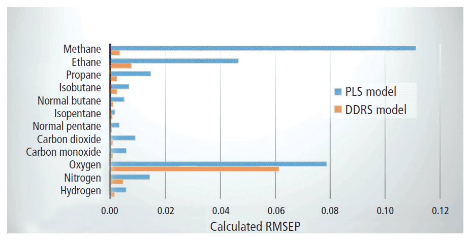 Looking at the results of modeling each target gas component (Table I), it can be seen that DDRS delivers high prediction precision with a relatively low number of required variables and only two PLS factors. RMSEP values are significantly lower across the board for DDRS versus plain PLS modeling (Figure 3), while R values were consistently >0.969, indicating a much better quality of fit. Additionally, an F-test to compare the two approaches confirmed that DDRS is a significantly better calibration model for component analysis in the gas mixtures.
