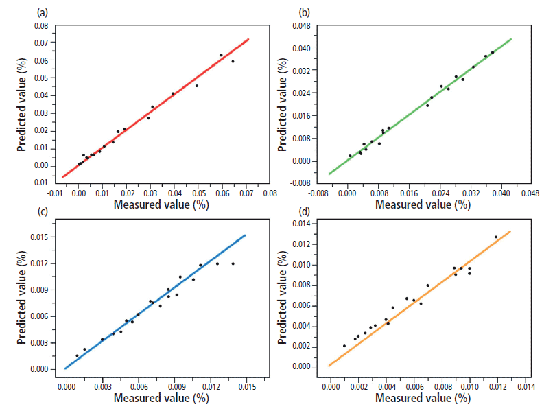 In terms of practical applicability, it is important that DDRS address the particular challenges of applying Raman spectroscopy to mud-logging gas analysis. Firstly, it must be able to successfully isolate a single gas target from within a highly overlapped and unpredictable matrix. This requirement is well evidenced by the results for methane, for which prediction results were improved tremendously by DDRS. Secondly, the model must be capable of quantifying low concentrations of heavier alkanes such as butane and pentane in mixtures dominated by lighter components. DDRS also performed extremely well in this respect, as can be seen by the excellent agreement between predicted and measured values for isobutane, normal butane, isopentane, and normal pentane (Figure 4).