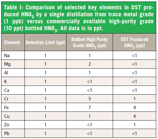 The ultra-low detection limits of ICP-MS necessitate the use of high-purity grade acids for standards, sample dilutions, and, increasingly, even for sample digestion. Although commercially available bottled high-purity (10 ppt grade) acid is readily available, it costs up to 10 times more than trace metal (1 ppb) grade acid. Once opened, and during use, a bottle of high-purity acid can easily become contaminated due to airborne contamination or analyst error. For these reasons, many laboratories are producing their own high-purity acid using the Savillex DST-1000 Acid Purification System. The DST-1000 produces HNO3, HCl, and HF that is as good as or better than commercially available acid (Table I), is easy to use, has a small footprint, and can pay for itself in months, or even weeks, depending on the laboratory's acid needs.