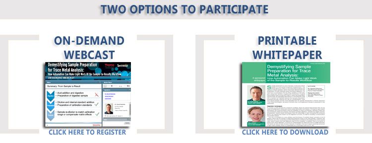Spectroscopy's webcast, "Demystifying Sample Preparation for Trace Metal Analysis: How Automation Can Make Light Work Of the Sample-to-Results Workflow " is now available on-demand for you to view at your convenience along with a complimentary whitepaper. This webcast discusses the application and benefits of an intelligent on-line autodilution system for rapid and efficient analysis of challenging samples.
