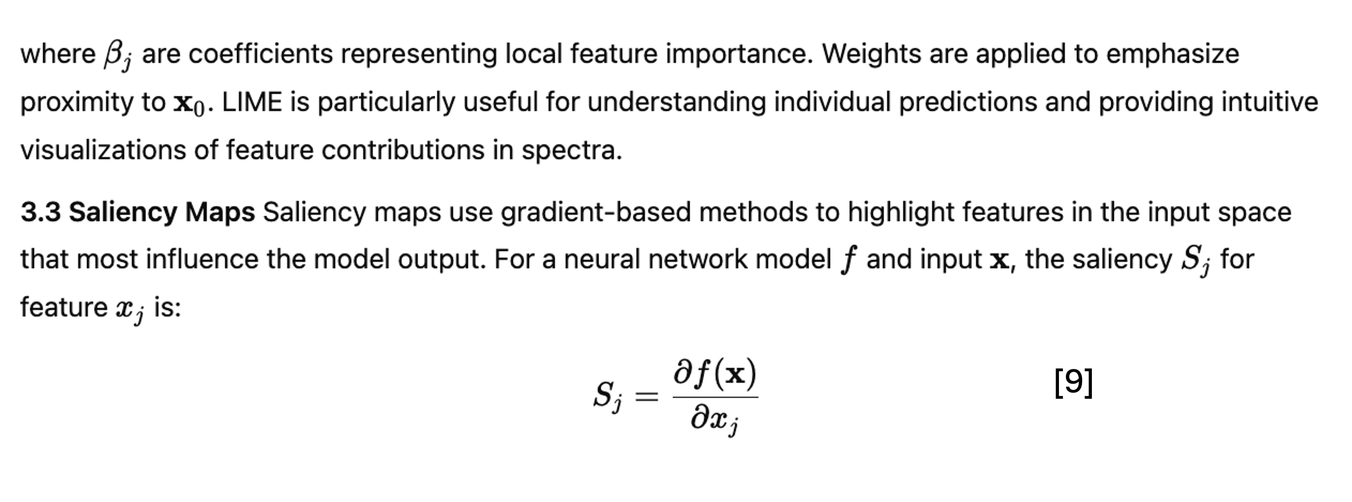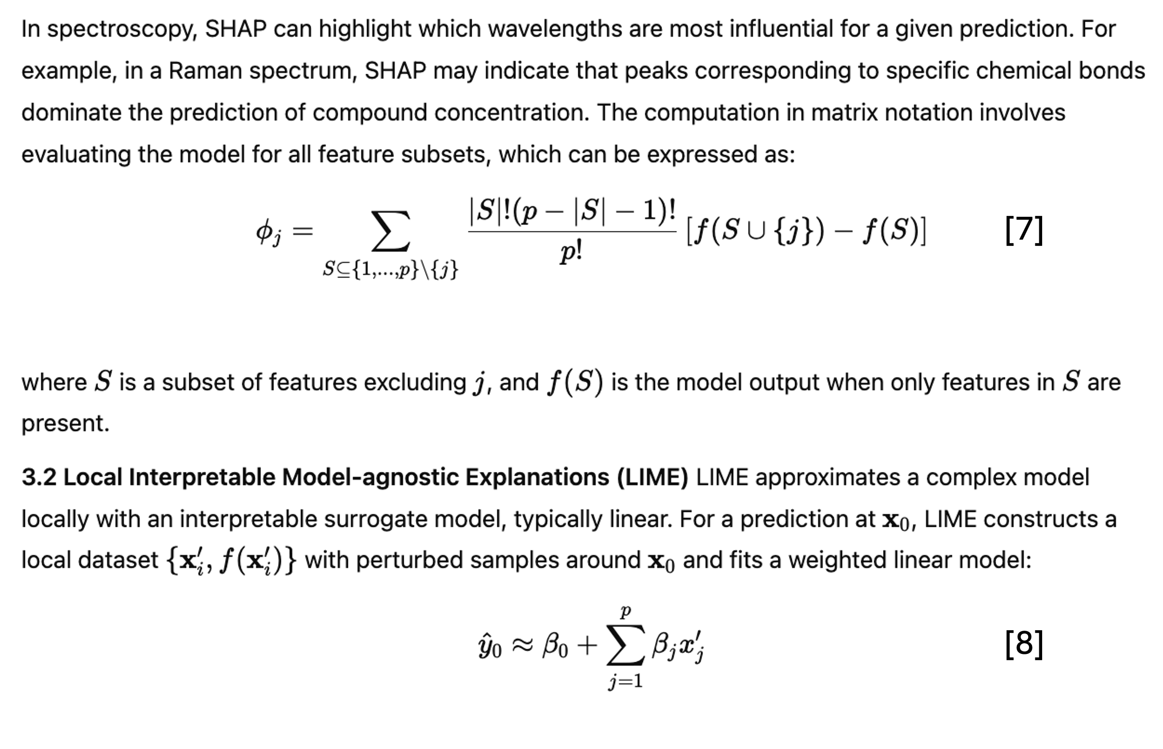 4.3 Limitations Although XAI provides valuable insights, it has limitations. SHAP and LIME can be computationally expensive for high-dimensional spectra. Gradient-based saliency maps can be noisy and sensitive to model architecture. Researchers should combine multiple XAI approaches and cross-validate interpretations with known chemical knowledge (3).