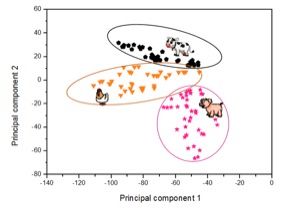 Our LIBS data are very complex because of the matrix of meat samples, which contain many elemental bands between the 350 and 850 nm wavelengths. In this study, identification of meat species was performed by evaluating the whole LIBS spectrum of the elemental composition of meat samples. Therefore, multivariate data analysis techniques were required. Chemometric techniques such as partial least squares (PLS) and principal component analysis (PCA) are widely used to enhance the analytical performance of LIBS. These advanced techniques reduce the complexity of spectra and provide robust and accurate models by reducing the dimensions of variables. They also eliminate laser fluctuations from shot to shot as well as physical and chemical matrix effects. In this study, PCA was used to discriminate the three different meat species (pork, chicken, and beef) and PLS was used to determine the adulteration ratio.