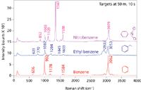 Raman spectroscopy is very sensitive to chemical composition and structure. This is because Raman spectra are representations of the Raman active vibrational modes of a molecule. When a molecule is altered either by adding extra atoms or replacing atoms with a different element, it changes the vibrational frequencies of various modes. The addition of extra atoms to a molecule also changes the total number of Raman active vibrational modes. This results in a significant change in the appearance of the Raman spectrum of the molecule. The process generates fingerprint Raman patterns that are unique to every chemical. Figure 5 shows the standoff Raman spectra of three very similar chemicals — benzene, ethyl benzene, and nitrobenzene — from a distance of 50 m with detection time of 10 s. Benzene and its derivatives are BTEX compounds and have harmful effects on the central nervous system. The strong aromatic C-H stretching Raman line of benzene appears at 3061 cm-1. The strong Raman band corresponding to the symmetric breathing mode of the benzene ring is observed at 992 cm-1. This vibrational mode is observed at 1002 and 1003 cm-1 in ethyl benzene and nitro benzene, respectively. The effect of the addition of the ethyl group to benzene is easily seen in Figure 5 where it shows a broad Raman band in the CH region at 2933 cm-1, which is characteristic of the aliphatic C-H stretching of the ethyl group. The aromatic C-H stretching mode of the benzene ring is observed at 3053 cm-1 in ethyl benzene. Similarly, the addition of the nitro group gives a very strong band at 1347 cm-1 in nitrobenzene due to symmetric stretching (νs) vibrations of the NO2 functional group and the C-H stretching mode of the benzene ring is shifted to 3079 cm-1 in nitrobenzene. Other Raman peaks of medium intensity in the nitrobenzene spectrum are at 853, 1003, 1109, and 1588 cm-1, attributed to NO2 bending, aromatic ring bending, C-N stretching, and aromatic ring stretching, respectively. A number of organic substances that are rich in nitro (NO2) groups are often used in explosive devices, such as nitroglycerine, trinitrotoluene (TNT), and triaminotrinitrobenzene (TATB) and can easily be identified through remote Raman spectroscopy.