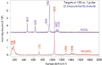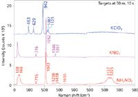 Figure 4: Remote Raman spectra of ammonium nitrate, potassium nitrate, and potassium per- chlorate from a distance of 50 m with a 10-s integration time. All spectra with 532-nm excitation, 30 mJ/pulse, 20 Hz, 50 ns gate width, as measured. Spectra have been shifted vertically for clarity.