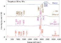 Highly volatile and flammable organic compounds are used as solvents and reagents in the chemical and materials industry (for example, acetone, diethyl ether, benzene, methanol, and pyridine). These colorless liquids could be concealed in water bottles and pose significant fire hazards for airlines. Presently, there are restrictions on carrying water and other clear liquids through airport check points, mostly due to the lack of detection capability of screening technologies in distinguishing water from various other hazardous clear liquid chemicals. Figure 6 shows that a standoff Raman system provides distinct identification of water from other flammable organic chemicals. The remote Raman spectra of water, ethanol, 2-propanol, and acetone were obtained through glass vials from a distance of 50 m with a 10-s integration time.