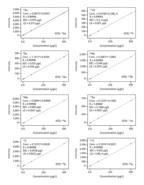 As can be observed in the curves shown in Figure 1, all correlation coefficients (r) were better than 0.9999. Moreover, low values of detection limits (LD), calculated automatically by LabSolution ICP-MS software with a 3σ method, indicate the high ability for trace contaminant analysis of the ICP-MS method used. For each wine, the results are summarized in Table II.