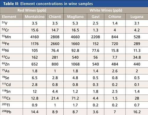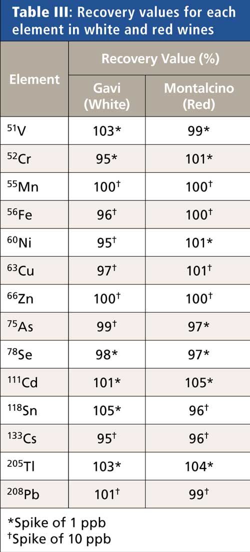 The results in Table II demonstrate that ICP-MS is able to simultaneously quantify all elements typically present in wine samples, including major elements like iron or manganese and trace elements such as arsenic, thallium, and vanadium.