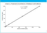 An affordable, high sensitivity ProRaman instrument was used with PLS method to successfully analyze low concentration methanol in 40% alcohol. Based on our findings, the detection limit for methanol in 40% of ethanol is much better than 50 ppm and reliable quantitative determination using PLS prediction could reach 50 ppm of methanol in 40% alcohol.