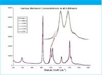 40% ethanol/water solution was prepared using 200-proof ethanol and distilled water. HPLC grade methanol was added into the 40% ethanol solution to make samples with methanol concentration ranging from 50 ppm to 2.5%. An Enwave Optronics' ProRaman instrument with laser excitation at 785 nm was used for the measurements. The sample solutions were measured in quartz cuvette in a sample holder. Figure 1 depicts the results of the measured spectra in the fingerprint region of the Raman spectra.