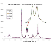 40% ethanol/water solution was prepared sing 200-proof ethanol and distilled water. HPLC grade methanol was added into the 40% ethanol solution to make samples with methanol concentration ranging from 50 ppm to 2.5%. An Enwave Optronics' ProRaman instrument with laser excitation at 785 nm was used for the measurements. The sample solutions were measured in quartz cuvette in a sample holder. Figure 1 depicts the results of the measured spectra in the fingerprint region of the Raman spectra.