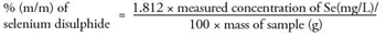 The selenium disulphide content in the sample, in percentage by mass (% m/m) is calculated using the following formula: