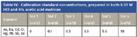 Table IV: Calibration standard concentrations, prepared in both 0.07 M HCl and 4% acetic acid matrices
