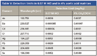 Table V: Detection limits in 0.07 M HCl and in 4% acetic acid matrices