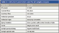 A Dual View Prodigy High Dispersion ICP spectrometer (Teledyne Leeman Labs, Hudson, New Hampshire) equipped with an 88-position autosampler was used to generate the data for this article. The sample introduction system consisted of a four-channel peristaltic pump, a glass cyclonic spray chamber with a center knockout tube, a single-piece quartz torch, and a Seaspray concentric nebulizer (Glass Expansion, Pocasset, Massachusetts). Instrument conditions used for all data collection are listed in Table III.