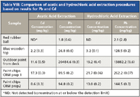 Results in Table VIII demonstrate the significant variability between extraction methods as well as variability within each extraction method. Results for duplicate preparations of the certified reference material further illustrate the challenges associated with obtaining reproducible results and indicate the reason that certified reference materials are not used for validating these extraction methods. Results indicate that the hydrochloric acid extraction procedure generally is more aggressive than the acetic acid procedure; however, a total dissolution method is needed to obtain results for cadmium and lead that would fall within the accepted concentration range for certified reference materials.