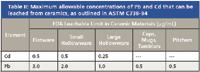 Table II: Maximum allowable concentrations of Pb and Cd that can be leached from ceramics, as outlined in ASTM C738-94