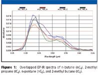 Figure 1 represents the EP-IR spectra of the four hydrocarbon homolog gases in the C-H stretch region. Please note that all four gases are spectrally highly overlapped. A formal qualification of EP-IR analytical resolution and specificity appears in Table I, which reports the cross sensitivity between all four hydrocarbon homolog compounds. We observe that the TUEV cross sensitivity analytical requirement of < ± 4% relative is not only met, but largely exceeded by the EP-IR spectrometer's performance.