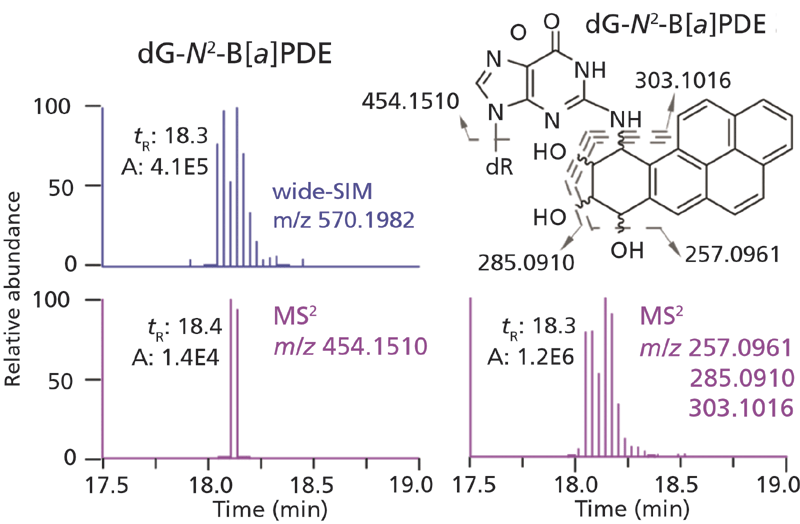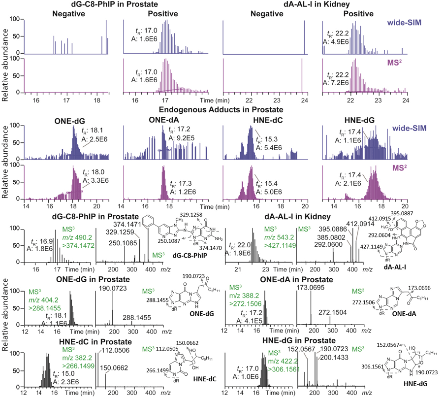 A new type of analysis called “wide-selected ion monitoring (SIM)/MS2” scanning, is capable of screening for a wide range of DNA adducts (chemical modifications to genomic DNA). This method has successfully identified DNA adducts from carcinogen exposures and oxidative stress in human prostate and kidney tissues.