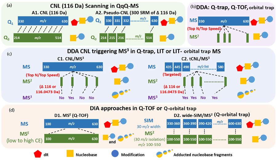 Figure 3: Schemes of DNA adductomic approaches using different mass spectrometric scanning strategies focusing on adducted 2'deoxyribonucleosides with precursors ([M + H]+ ). (a) The continuous scanning of the constant neutral loss (CNL) of 116 Da (dR) in QqQ MS. This approach is achieved either by using the CNL scan mode of 116 Da (left), or in pseudo-CNL by setting up 300 SRM transitions of [M + H]+ → [M – 116 + H]+ (right). (b) The data-dependent acquisition (DDA) of top N (the most abundant N ions) or top speed (acquire as many dependent scans as possible within the cycle time) mode in Q-trap, Q-TOF or orbital trap. (c) The CNL (116 or 116.0473 Da) triggering of MS3 in trap-based MS that can perform multi-stage MS scan (Q-trap, LIT, or LIT-orbital trap). Adduct precursors are fragmented if they are selected by the survey scan in DDA mode (left) or if they are in the targeted inclusion list (right). The subsequent MS3 scan is only triggered if the loss of 116 or 116.0473 Da is detected in the MS2 scan. (d) The adductomics approach using data-independent acquisition (DIA) methods in HRAMS. In Q-TOF (left), a full scan of all precursor ions, including presumed adducts, is acquired followed by MSE (ramping collision energy: low to high). The ions are fragmented to generate the aglycones [M + H – 116]+ and other possible fragment ions. In wide-SIM/MS2 (right) conducted in the Q-orbital trap, all ions, including adduct precursors, are detected in SIM of 30 m/z windows in the orbital trap instrument, and their aglycones are detected in the following MS2 scan.