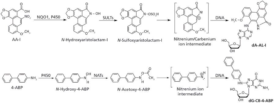Figure 1: Aristolochic acid-I (AA-I) and 4-aminobiphenyl (4-ABP) are shown as prototypical procarcinogens. AA-I undergoes nitro-reduction through NAD(P)H:quinone oxidoreductase (NQO1), or cytochrome P450. The resulting N-hydroxyaristolactam-I is bioactivated by sulfotransferases (SULTs) to form an unstable N-sulfoxy ester, which quickly undergoes heterolytic cleavage to produce the reactive nitrenium/carbenium ion intermediate that forms dA-AL-I and other DNA adducts. 4-ABP undergoes N-hydroxylation by P450s, then it is further bioactivated by N-acetyltransferases (NATs) to form the N-acetoxy ester, which leads to the formation of dG-C8-4-ABP through the nitrenium ion intermediate.