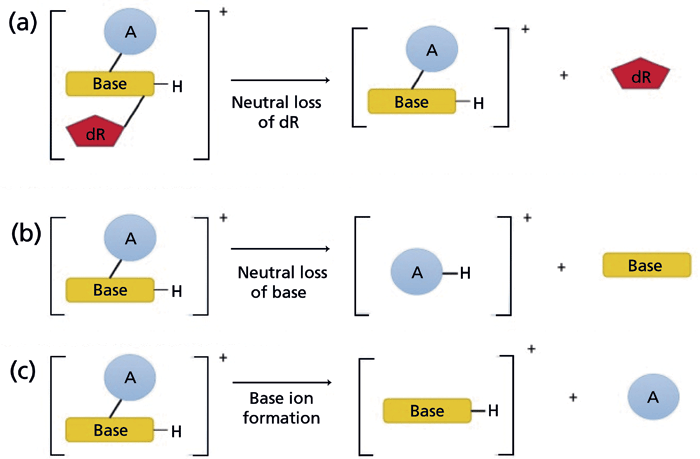 Figure 2: The fragmentation pathways of modified nucleosides analyzed by LC–MS. (a) Most modified nucleosides undergo fragmentation in MS/MS to form the aglycone with the neutral loss of 2'-deoxyribose (dR). Other common fragmentations include (b) the neutral loss of the nucleobase, and (c) the formation of nucleobase ions (34). Copyright MDPI 2017. Adapted with permission from reference 34.