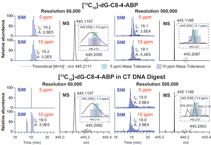 Figure 5: Extracted ion chromatograms (EICs) and mass spectra of precursor [13C10]-dG-C8-4-ABP in pure solvent or in calf thymus DNA digest analyzed by wide-SIM/MS2 at resolutions 60,000 and 500,000 (FWHM at 200 m/z). Precursor ions were extracted at 5 and 10 ppm mass tolerance. The zoomed-in mass spectrum between m/z 445.20 and 445.22 shows the location of the theoretical m/z of precursor ion (445.2111, red dash line), the mass range of 5 ppm (teal box) and 10 ppm (lavender box) (40). Copyright ACS 2017. Adapted with permission from reference 40.