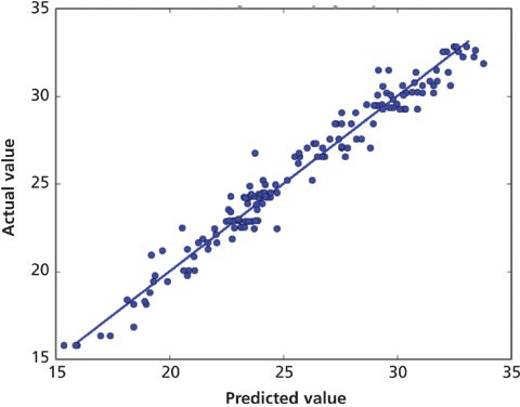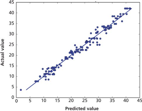 Figure 5: Volatile matter in coal (percent), predicted by LIBS versus actual.