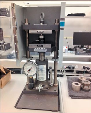 Figure 1: Typical sample press. There is a die between the platens and extra dies to the right of the press.