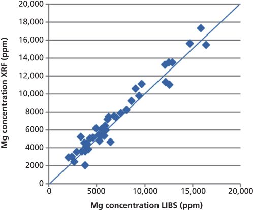 Similar to the coal work, a LIBS analysis of core samples from a drilling operation (energy exploration) was performed to determine elemental concentrations. As previously done, samples were ground and pressed into pellets. A partial least squares-based model was used to quantify concentrations from the LIBS spectra, using X-ray fluorescence (XRF) measurements as the standard method. Example relative standard deviations for multiple elements shows the repeatability of the LIBS measurement to be between 2% and 6%. Figure 7 shows the results for Mg, which are representative of most of the elements tested. It is expected that the uncertainty in the XRF measurement is comparable if not greater than the uncertainty in the Mg measurement.