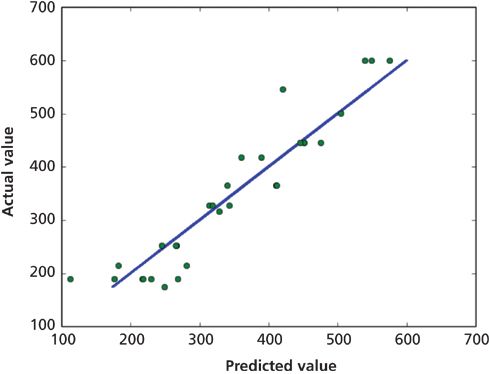 Figure 4: Prediction of potassium in soil from a very limited dataset. For the predicted value: explained variance = 89%, mean error = 34.