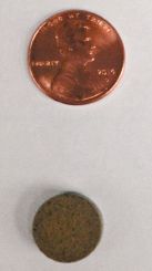 Homogenizing the sample is thus the easier approach, from a calibration and analysis standpoint. This can be done using a variety of methods. In the laboratory, samples are commonly ground and pressed in a pellet press with a known force for a particular period of time. Figure 1 shows a common sample press used in our laboratory. Sample is placed in the dies (examples shown on the right) and then pressed to up to 20 tons between the platens in the press. From experience, it is important to press the samples to uniform pressure and time to ensure that the LIBS ablation event remains the same for each analysis. Varying time and pressure in the preparation results in samples that ablate differently, and hence have unwanted spectral variations. Figure 2 illustrates a pellet pressed from a soil sample. The pellet is hard (does not crumble) and has a slightly smaller diameter than a United States penny.