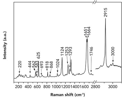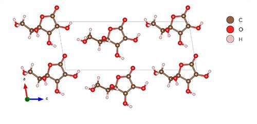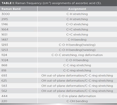 Ascorbic acid crystal belongs to the monoclinic crystal system, and its space group is P21 (32,33). Figures 1 and 2 show the crystal structure and Raman spectrum of ascorbic acid, respectively, in a normal-pressure environment. The Raman spectrum of ascorbic acid is consistent with what Singh and associates have reported (8). The strong Raman scattering lines located at 1124, 1651, 1664, and 2915 cm–1 are assigned to C-O bending, C=C stretching, and C-H stretching, respectively. Peaks at 562 and 583 cm-1 are attributed to be OH out-of-plane deformation and C=C ring stretching mode, respectively. Detailed Raman vibrational assignments are given in Table I.