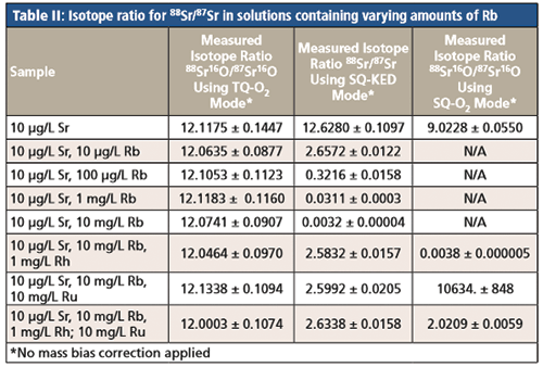 In a second experiment, solutions containing 10 µg/L and varying concentrations of Rb were analyzed and the isotope ratio 88Sr/87Sr was evaluated. Furthermore, solutions containing equal amounts of Sr and Rb in a matrix containing either or both 1 mg/L of Pd and 10 mg/L of Ru (to account for the lower abundance of the 104Ru isotope in comparison to monoisotopic 103Rh) were analyzed. Typically, considering the isotopic abundance of the strontium isotopes 87Sr and 88Sr, one would expect a theoretical isotope ratio of 11.7971. The results are displayed in Table II.