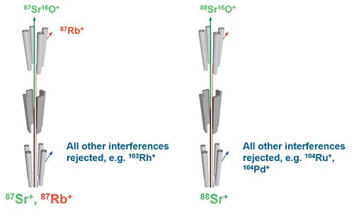Despite the numerous inherent advantages of using inductively coupled plasma–mass spectrometry (ICP-MS) as a tool for trace-elemental analysis, the removal of spectral interferences is still a concern for some applications, especially in metallurgical, environmental, and geological studies. Isobaric interferences such as 87Rb on 87Sr and 204Hg on 204Pb are difficult to remove even using high-resolution instruments. The use of reactive gases inside the ICP-MS collision–reaction cell (CRC) system may help to overcome such isobaric interferences, since isotopes of different elements may react differently and hence may differ in mass after a chemical reaction. To control unwanted side reactions, an additional mass-filtering quadrupole needs to be situated ahead of the collision–reaction cell, so that ions entering the cell can be controlled and unwanted side reactions can be avoided.