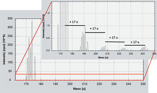 Figure 2: Full mass spectrum illustrating the formation of Yb-derived product ions acquired using single-quadrupole operation and ammonia as reaction gas.
