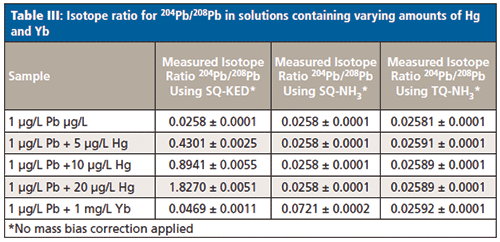 Table III clearly shows that, again, KED does not enable the removal of isobaric interferences, as the measured isotope ratio changes with increasing concentration of Hg added to the solution. In contrast, the use of NH3 as a reactive gas in single-quadrupole mode is capable of eliminating the isobaric 204Hg interference from 204Pb. Because no other ions are present in the ion beam when analyzing a solution containing only Hg and Pb, the use of an additional mass filter or of Q1 as an ion guide is unnecessary. However, for real sample analysis this situation is almost never the case. If for example rare-earth elements are present in the sample solution (which is likely in geological samples such as soils or rock digests), other cluster ions may be formed with NH3, so that m/z 204 is again interfered. To test this phenomenon, 1 mg/L of ytterbium was added to the measured solution to introduce 170Yb(NH3)2 as a potential interference on 204Pb in SQ-NH3 mode. Again, a biased 204Pb/208Pb isotope ratio is observed, clearly showing that there is an effect from 170Yb(NH3)2 interference on 204Pb in SQ-NH3 mode. To visualize this newly formed polyatomic interference, a full mass spectrum was acquired using NH3 as reactive gas (Figure 2).