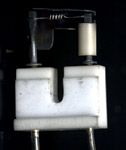 Figure 1: Photograph of a coiled filament used in an electron ionization source. Look closely to see the ion burn behind the filament. Cropped from an original photograph taken by Frederick Strobel, Manager of the Mass Spectrometry Facility at Emory University, and used with permission.