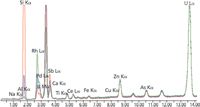 Figure 2 shows a mining sample powder of Canmet DH-1, which has a known concentration of uranium at 0.26 wt% compared with a measured concentration in the previous glass sample of 1.68 wt%. Here the red line represents the powder contained within a thinner Mylar envelope, blue within a thicker 50 µm plastic bag, and green the same 50 µm sample bag using a rhodium primary beam filter which improves lower limits of detection for the uranium X-ray lines. Both the Mylar and blue 50 µm plastic bag samples were analyzed without a filter in place. By comparing the blue and green spectra it is evident that filtering improves the peak to background for the U(Lα) line allowing for improved detection limits while using the thicker barrier plastic.
